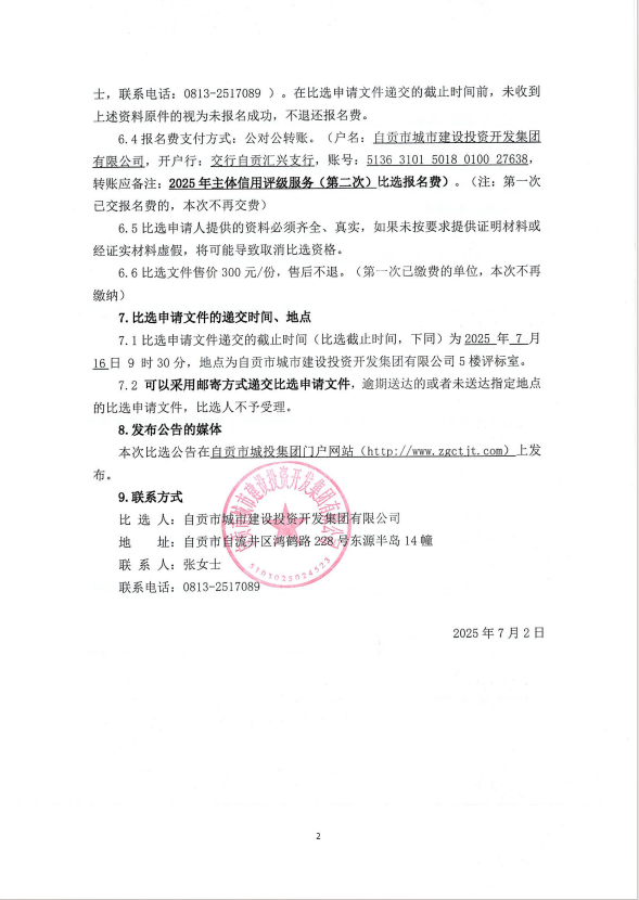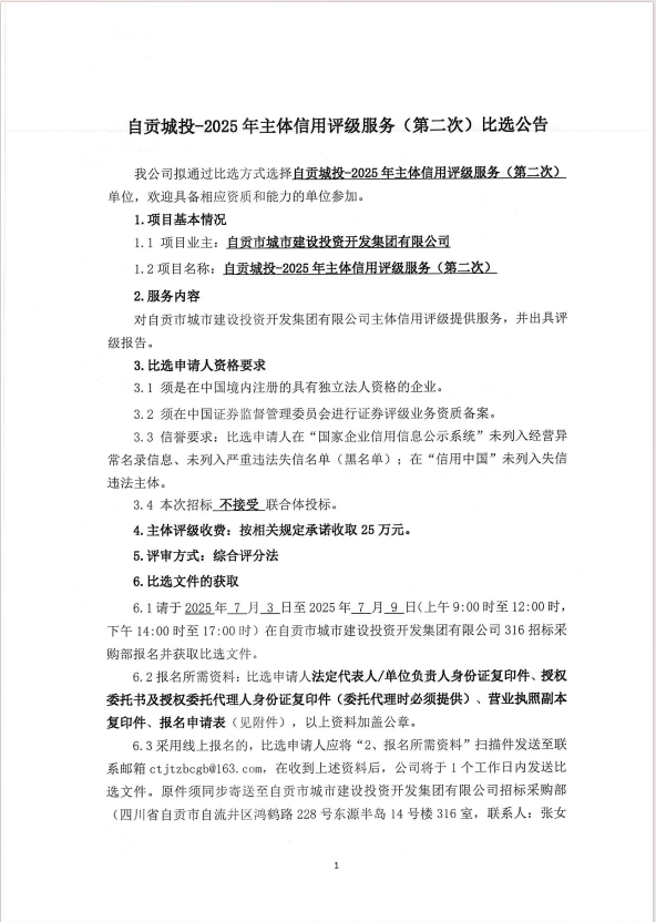 自贡城投-2025年主体信用评级服务(第二次)比选公告