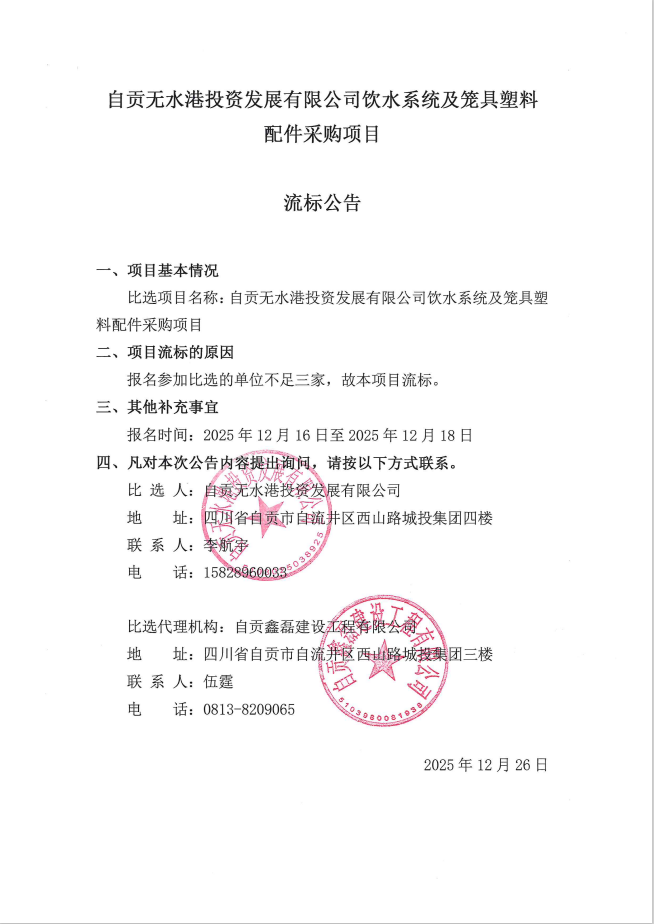 自贡无水港投资发展有限公司饮水系统及笼具塑料配件采购项目流标公告