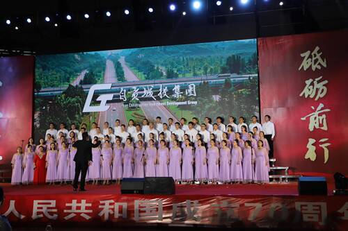 为备战好自贡市庆祝中华人民共和国成立70周年歌咏会,自贡城投集团高度重视,从7月份起,在集团本部、各子公司选拔81人开始排练,所有参赛人员均来自公司一线岗位职工,他们刻苦排练,在舞台上展示出城投人的精神风貌,也赢得在场观众的掌声。