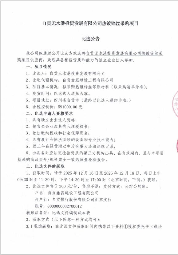 自贡无水港投资发展有限公司热镀锌丝采购项目比选公告