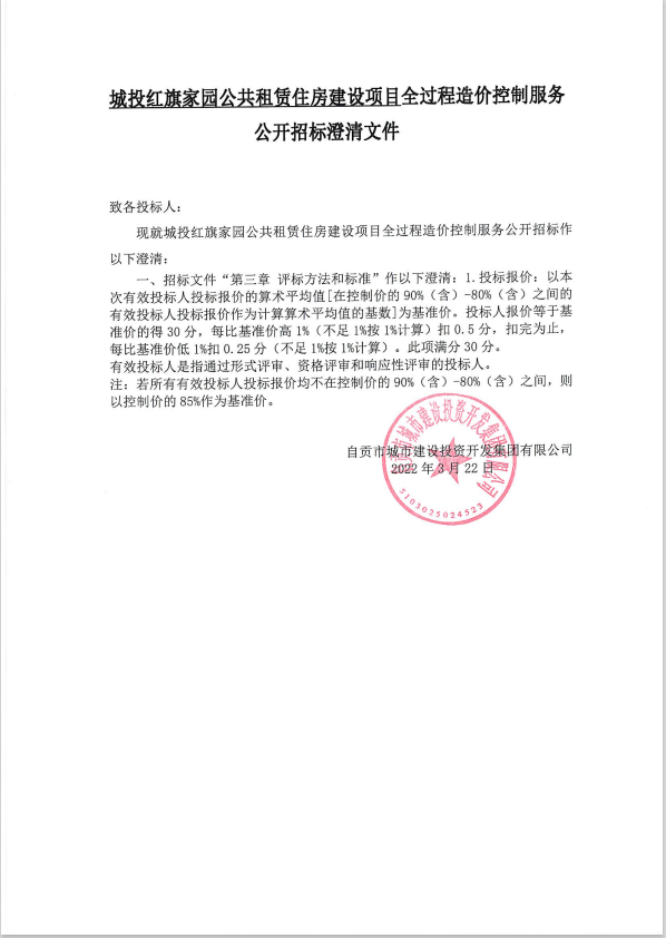 城投红旗家园公共租赁住房建设项目全过程造价控制服务公开招标澄清文件