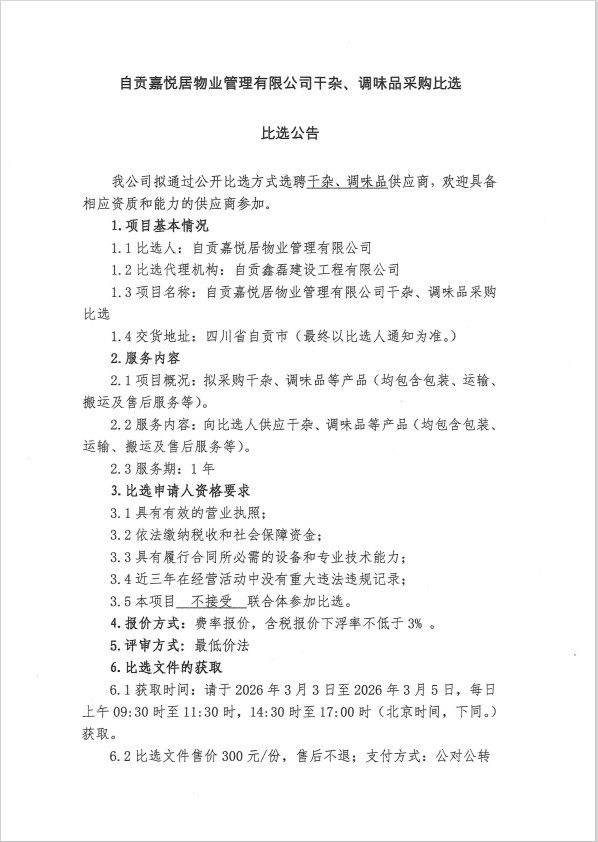 自贡嘉悦居物业管理有限公司干杂、调味品采购比选比选公告