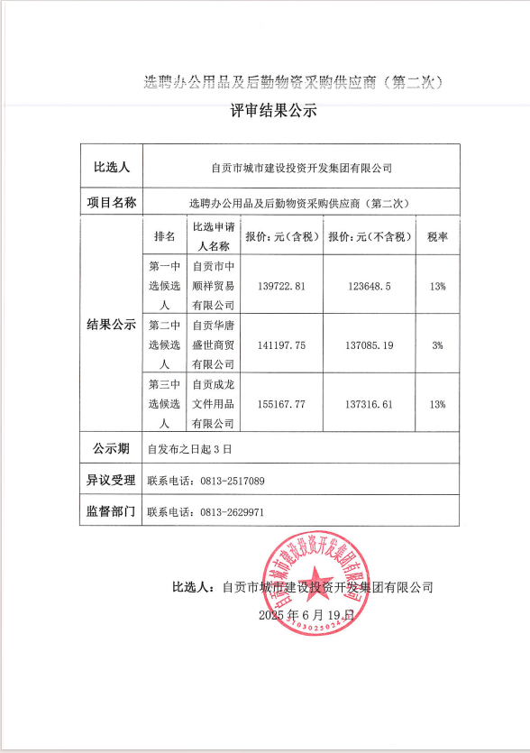 选聘办公用品及后勤物资采购供应商(第二次)评审结果公示