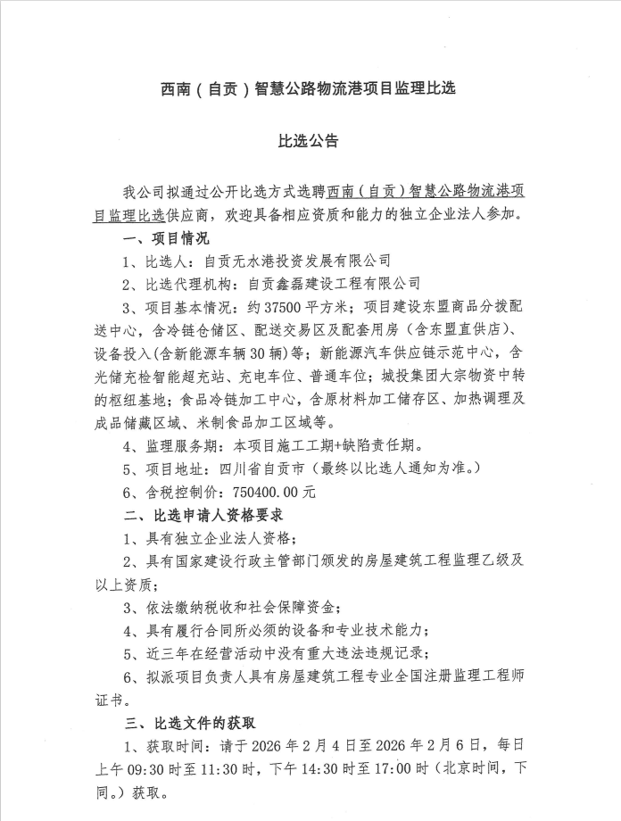 西南(自贡)智慧公路物流港项目监理比选比选公告