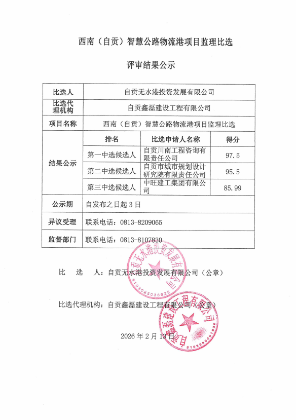 西南(自贡)智慧公路物流港项目监理比选评审结果公示