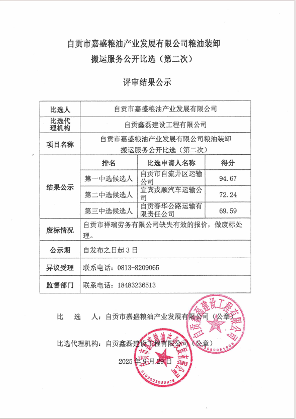 自贡市嘉盛粮油产业发展有限公司粮油装卸搬运服务公开比选(第二次)评审结果公示