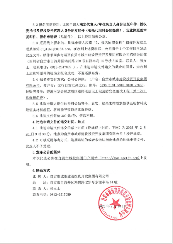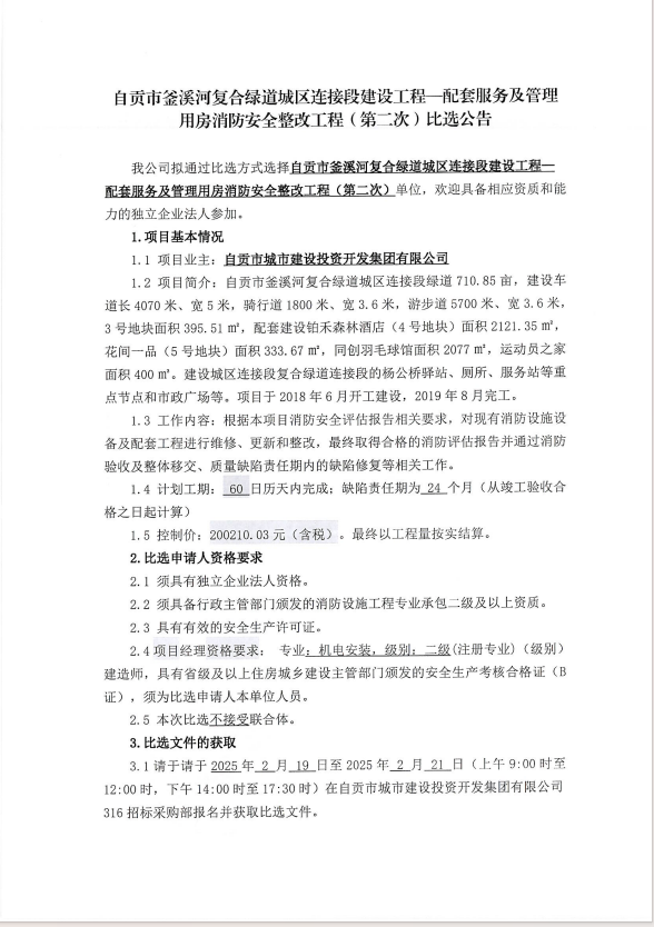 自贡市釜溪河复合绿道城区连接段建设工程——配套服务及管理用房消防安全整改工程(第二次)比选公告