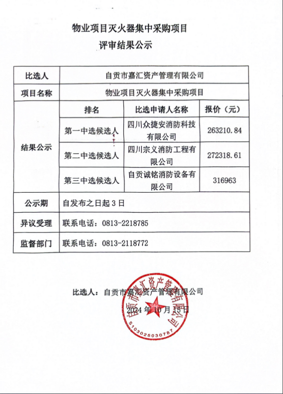 物业项目灭火器集中采购项目评审结果公示