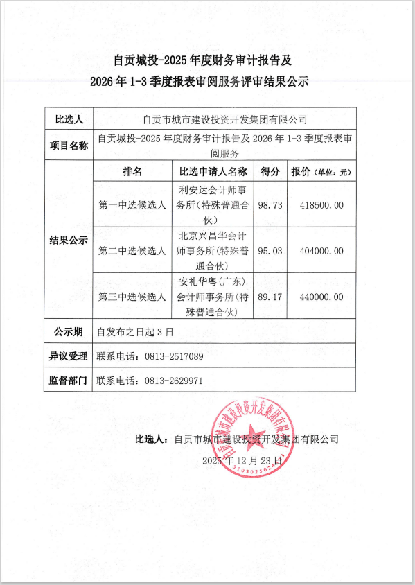 自贡城投-2025年度财务审计报告及2026年1-3季度报表审阅服务评审结果公示