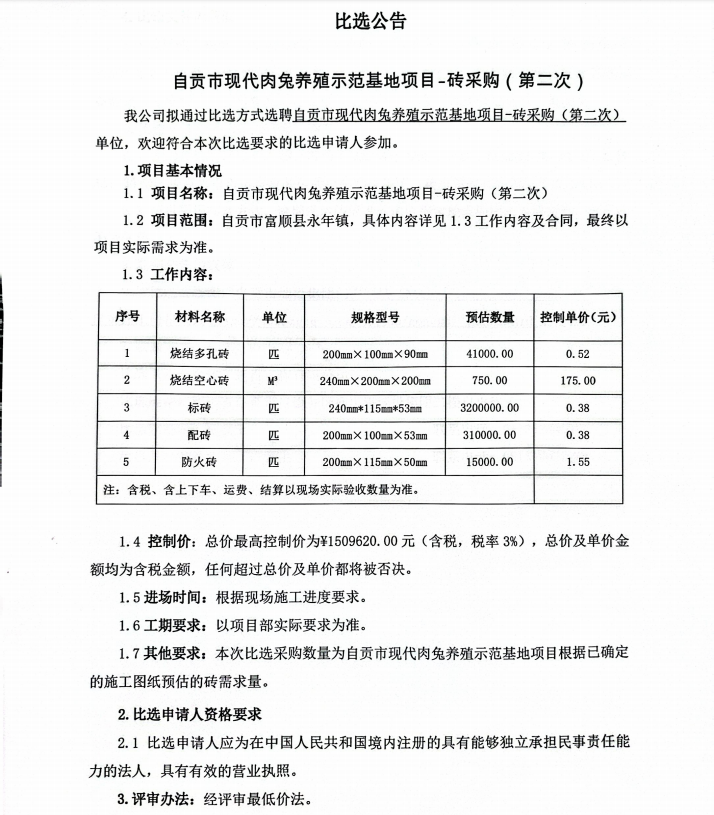 自贡市现代肉兔养殖示范基地项目-砖采购(第二次)比选公告