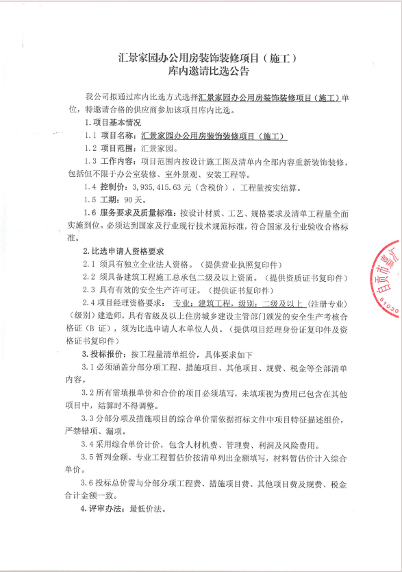 汇景家园办公用房装饰装修项目(施工)库内邀请比选公告
