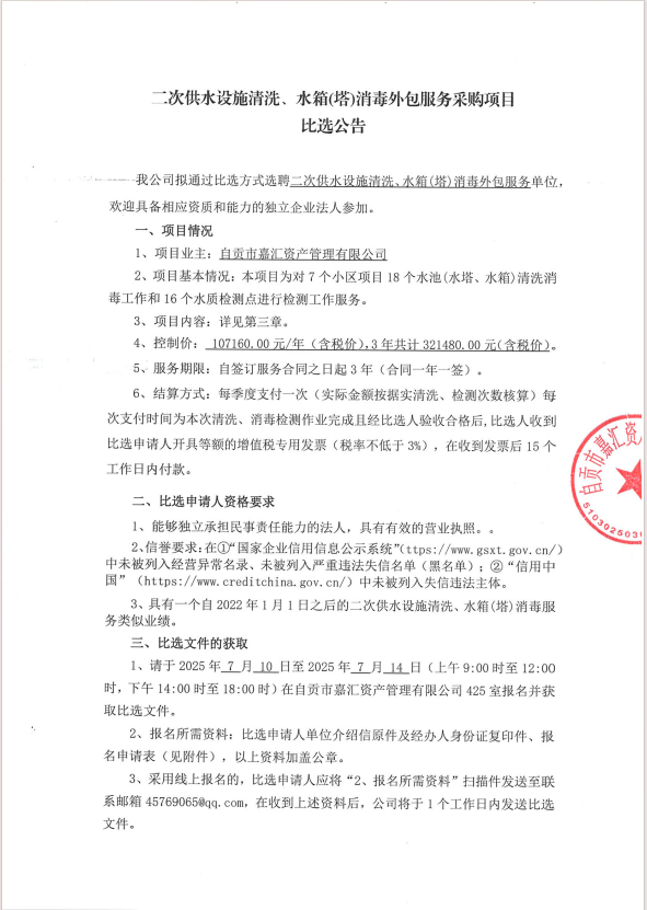 二次供水设施清洗、水箱(塔)消毒外包服务采购项目比选公告