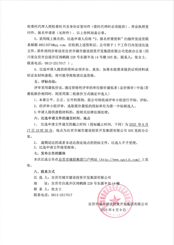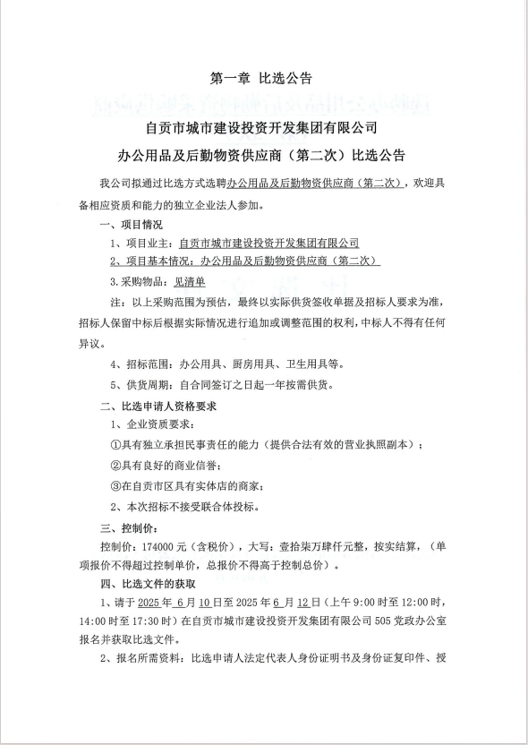 自贡市城市建设投资开发集团有限公司办公用品及后勤物资供应商(第二次)比选公告