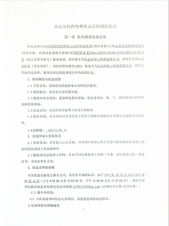 自贡市现代肉兔养殖示范基地项目监理库内邀请比选公告