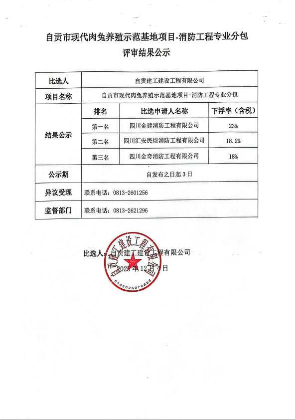 自贡市现代肉兔养殖示范基地项目-消防工程专业分包评审结果公示