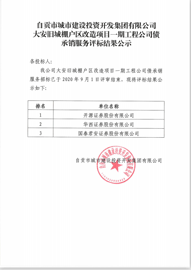 自贡市城市建设投资开发集团有限公司大安旧城棚户区改造项目一期工程公司债承销服务评标结果公示