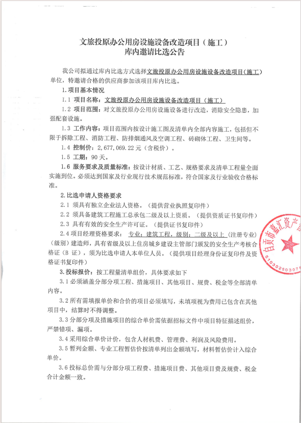 文旅投原办公用房设施设备改造项目(施工)库内邀请比选公告