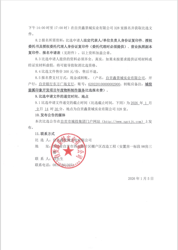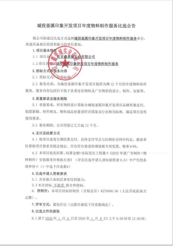 城投釜溪印象开发项目年度物料制作服务比选公告