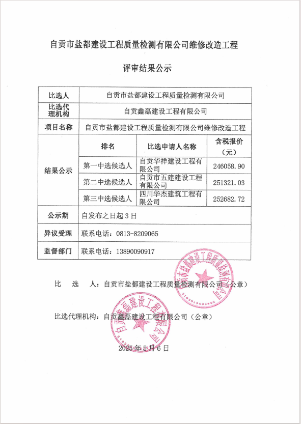 自贡市盐都建设工程质量检测有限公司维修改造工程评审结果公示