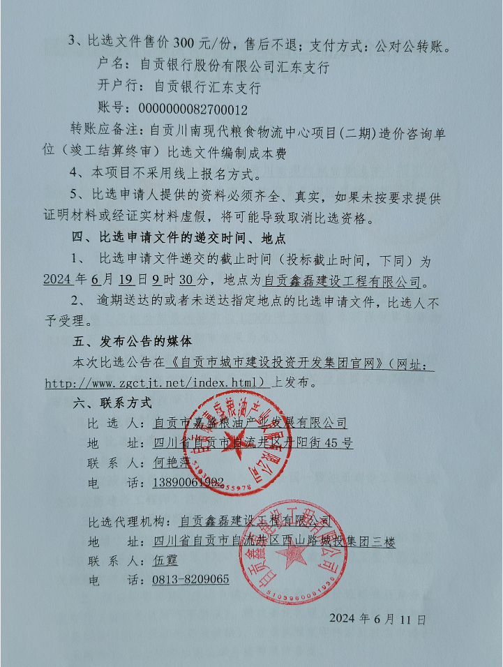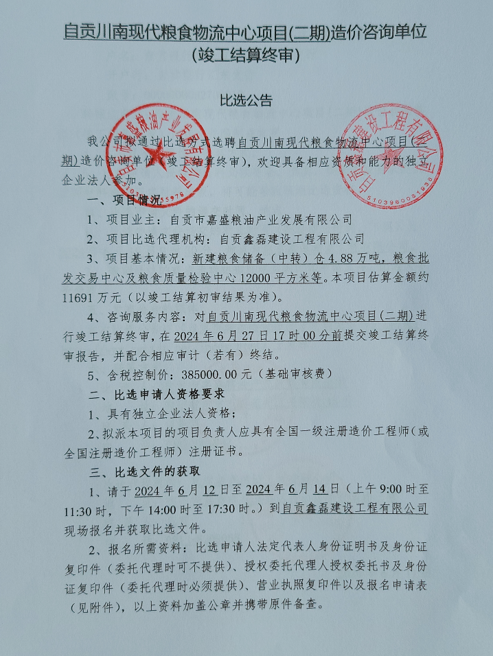 自贡川南现代粮食物流中心项目(二期)造价咨询单位(竣工结算终审)比选公告