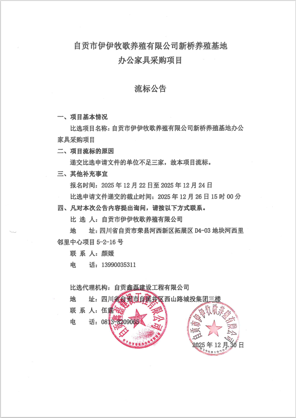 自贡市伊伊牧歌养殖有限公司新桥养殖基地办公家具采购项目流标公告