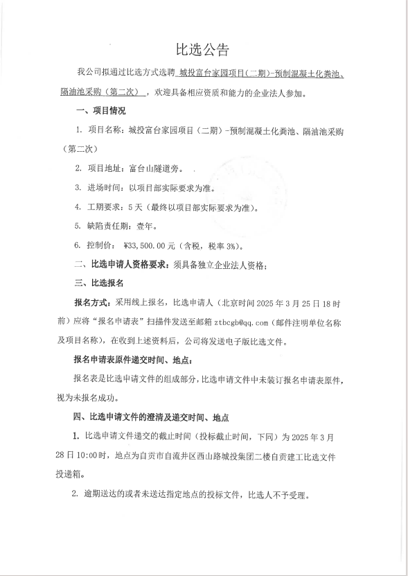 城投富台家园项目二期—预制混凝土化粪池、隔油池采购(第二次)比选公告