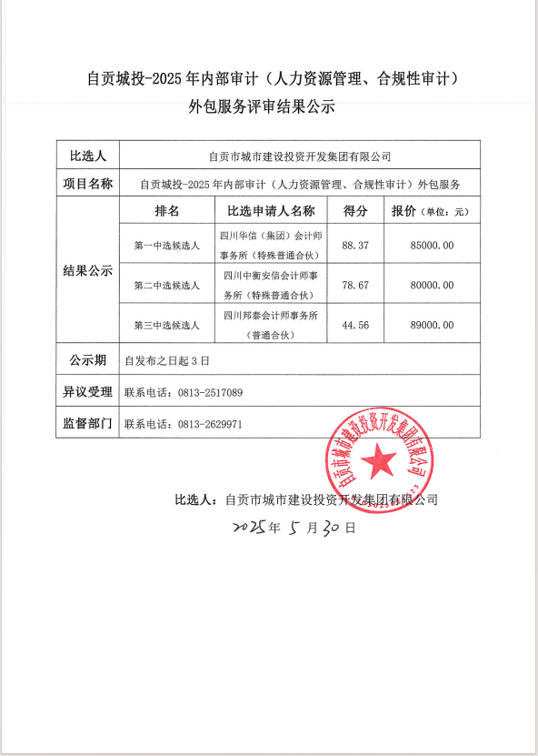 自贡城投-2025年内部审计(人力资源管理、合规性审计)外包服务评审结果公示