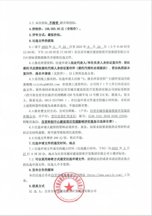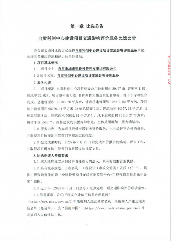 自贡科创中心建设项目交通影响评价服务比选公告