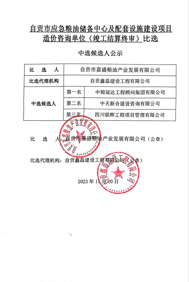 自贡市应急粮油储备中心及配套设施建设项目造价咨询单位(竣工结算终审)比选中选候选人公示