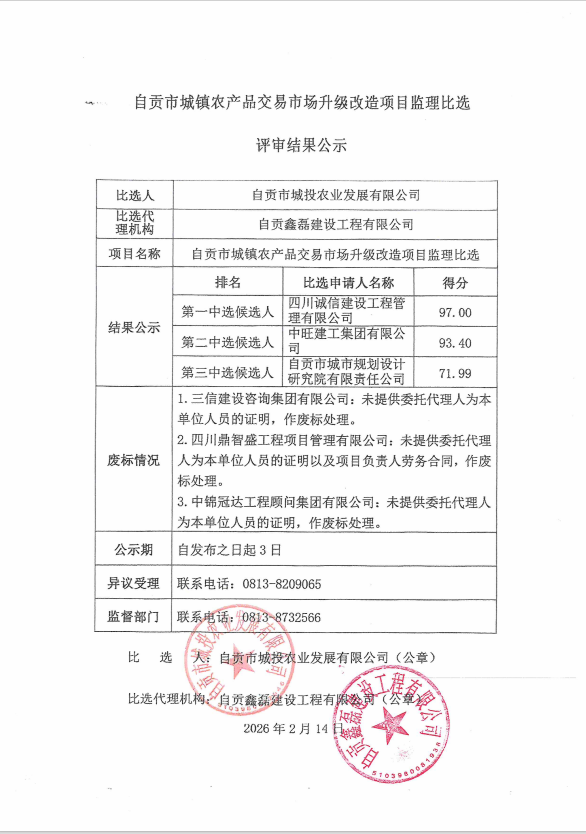 自贡市城镇农产品交易市场升级改造项目监理比选评审结果公示