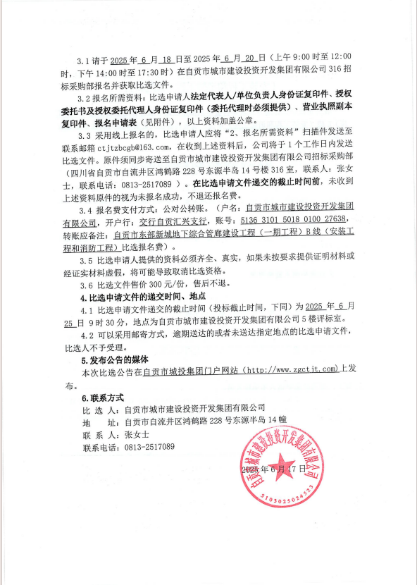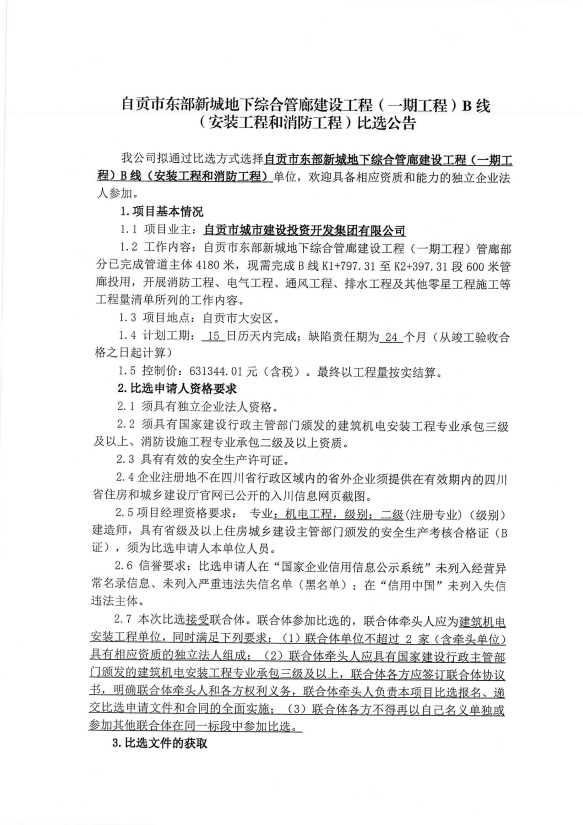 自贡市东部新城地下综合管廊建设工程(一期工程)B线(安装工程和消防工程)比选公告