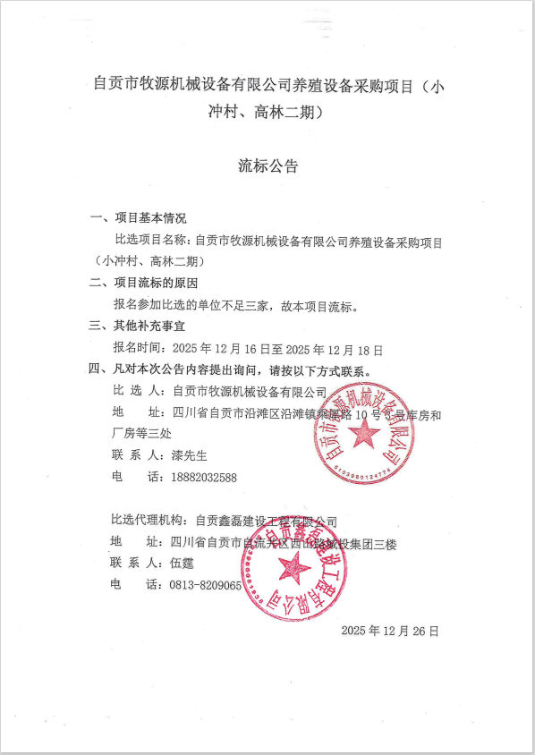自贡市牧源机械设备有限公司养殖设备采购项目(小冲村、高林二期)流标公告