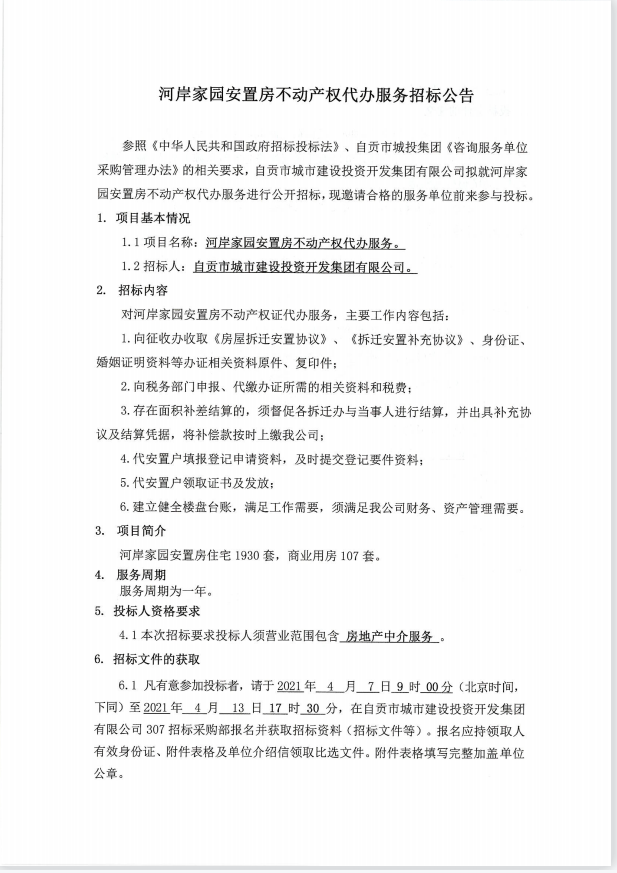 河岸家园安置房不动产权代办服务招标公告
