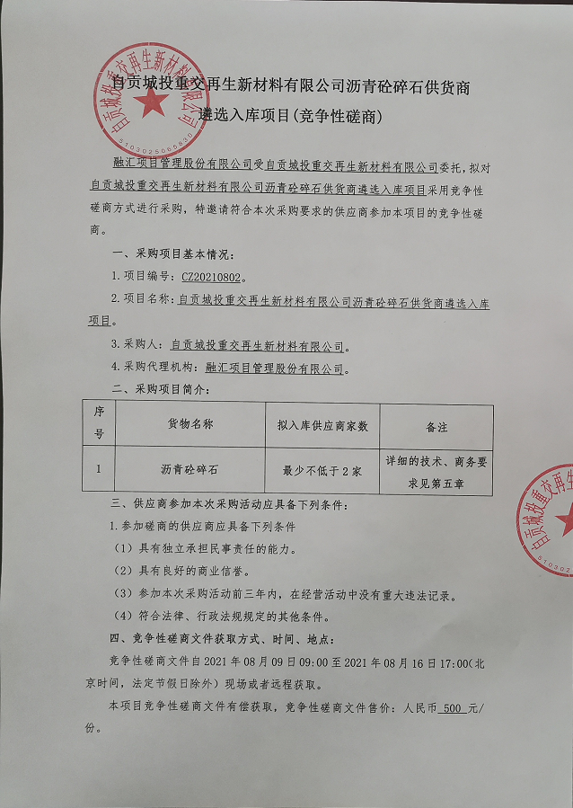 自贡城投重交再生新材料有限公司沥青砼碎石供货商遴选入库项目(竞争性磋商)