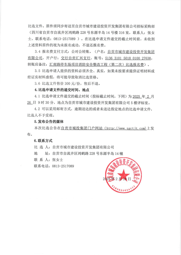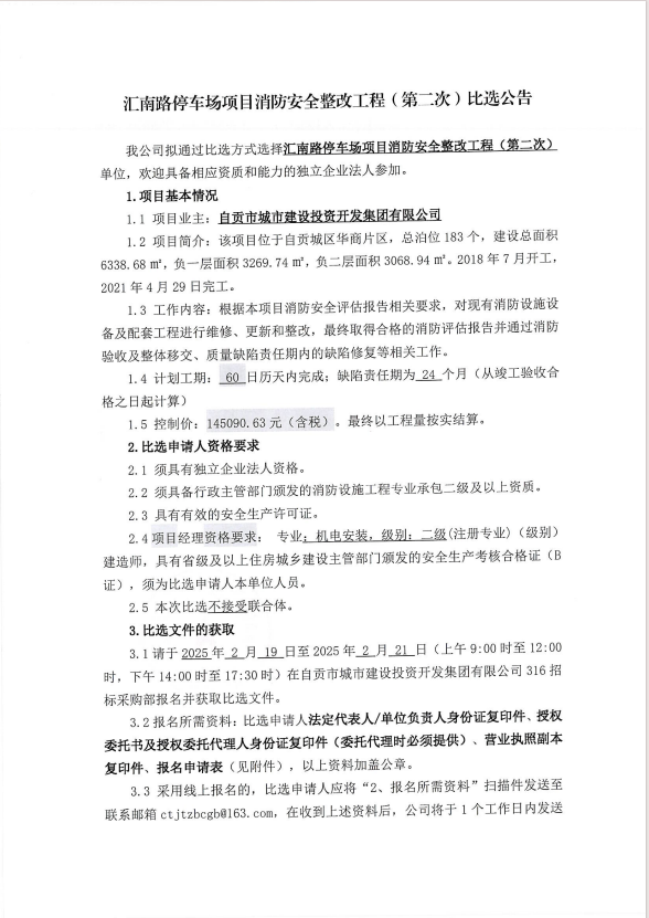 汇南路停车场项目消防安全整改工程(第二次)比选公告