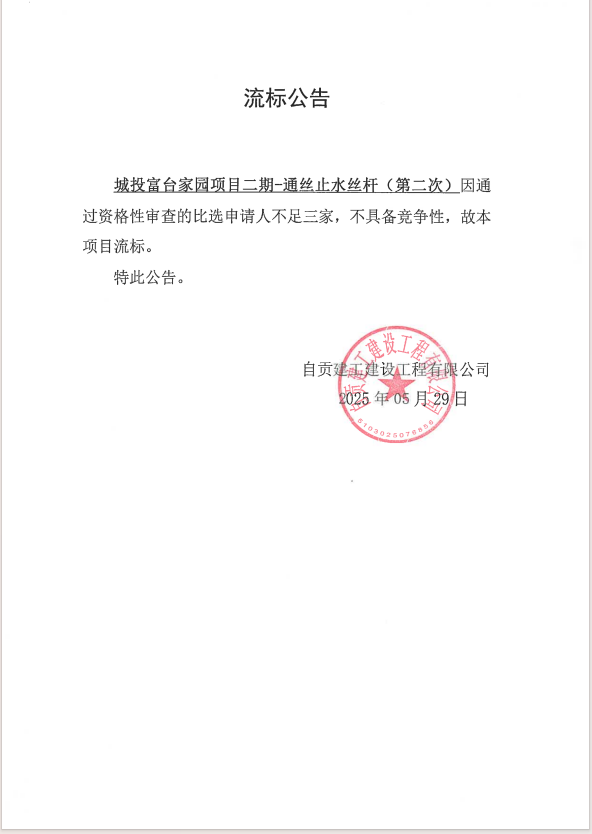 城投富台家园项目二期-通丝止水丝杆(第二次)采购比选流标公告