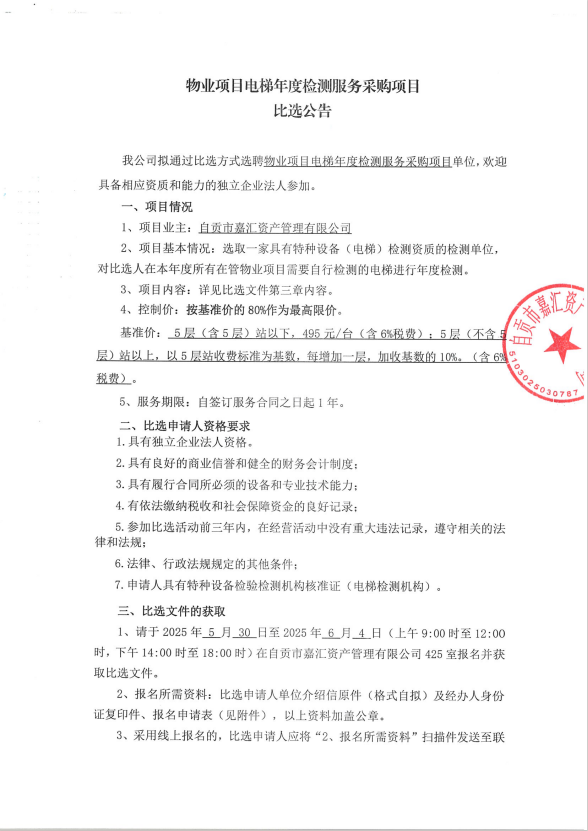 物业项目电梯年度检测服务采购项目比选公告