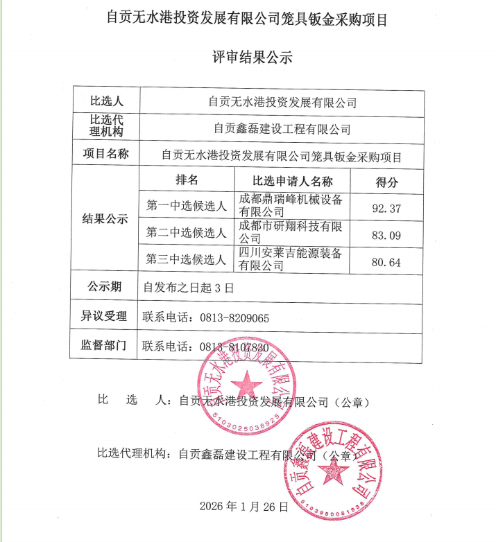 自贡无水港投资发展有限公司笼具钣金采购项目评审结果公示