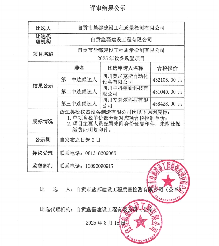 自贡市盐都建设工程质量检测有限公司2025年设备购置项目评审结果公示