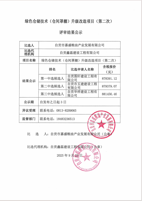 绿色仓储技术(仓间罩棚)升级改造项目(第二次)评审结果公示