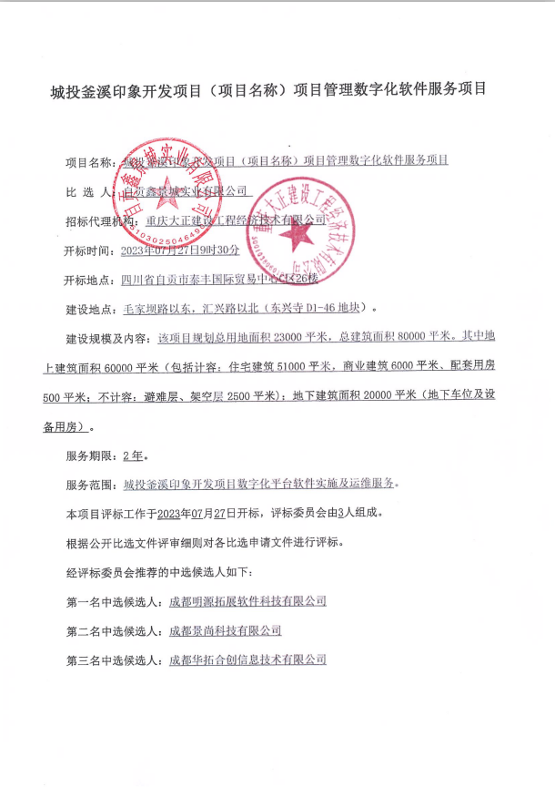 城投釜溪印象开发项目(项目名称)项目管理数字化软件服务项目比选结果公示