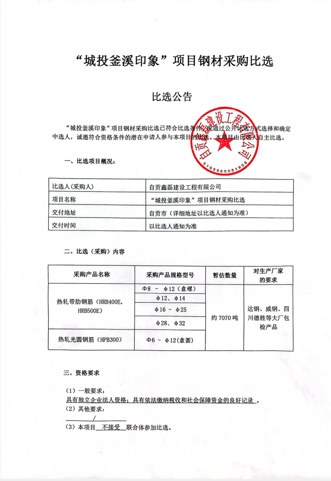 “城投釜溪印象”项目钢材采购比选比选公告