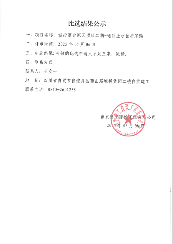 城投富台家园项目二期-通丝止水丝杆采购比选结果公示