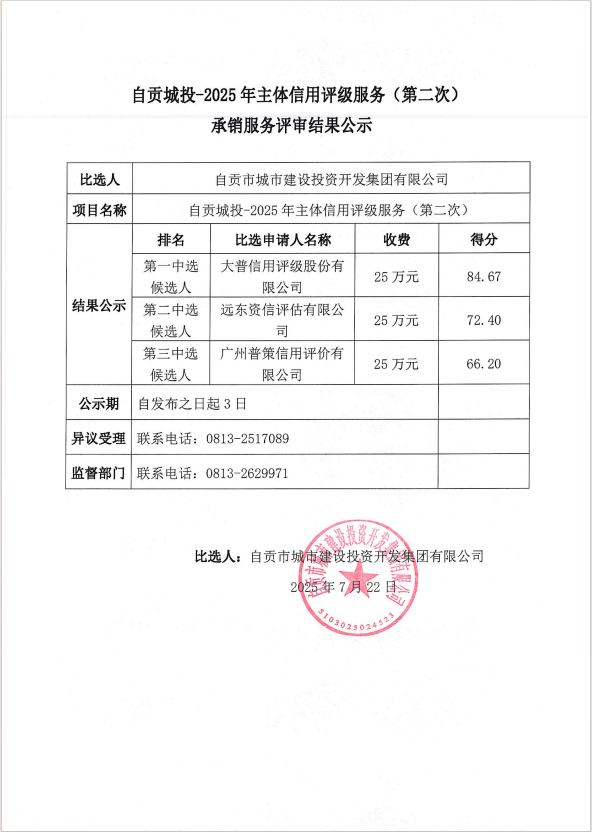 自贡城投-2025年主体信用评级服务(第二次)承销服务评审结果公示