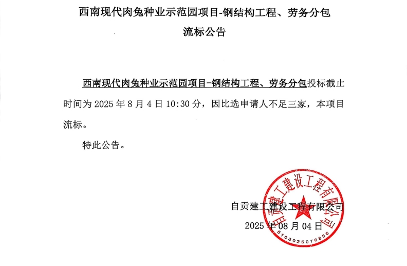 自贡市现代肉兔养殖示范基地-钢结构工程、劳务分包流标公告