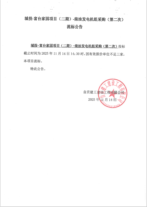 城投-富台家园项目(二期)-柴油发电机组采购(第二次)流标公告