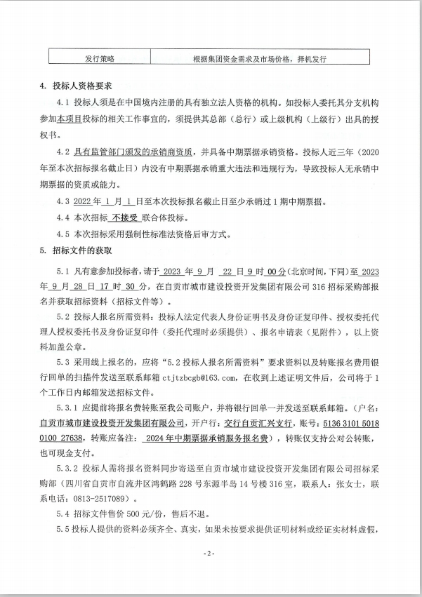 自贡城投-2024年中期票据承销服务招标公告