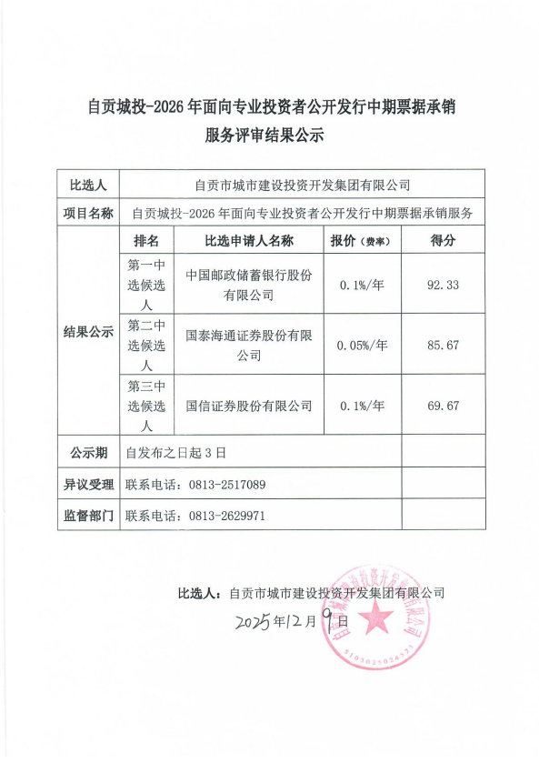 自贡城投-2026年面向专业投资者公开发行中期票据承销服务评审结果公示