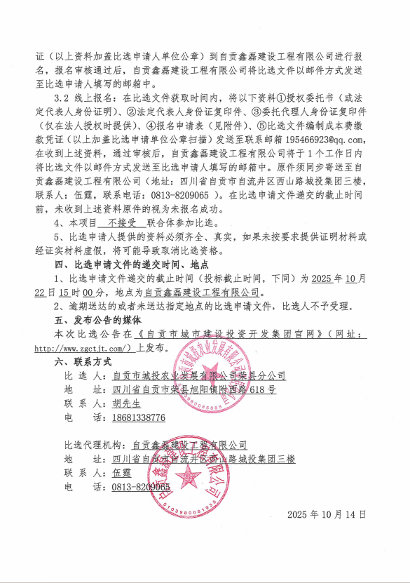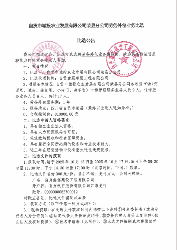 自贡市城投农业发展有限公司荣县分公司劳务外包业务比选比选公告