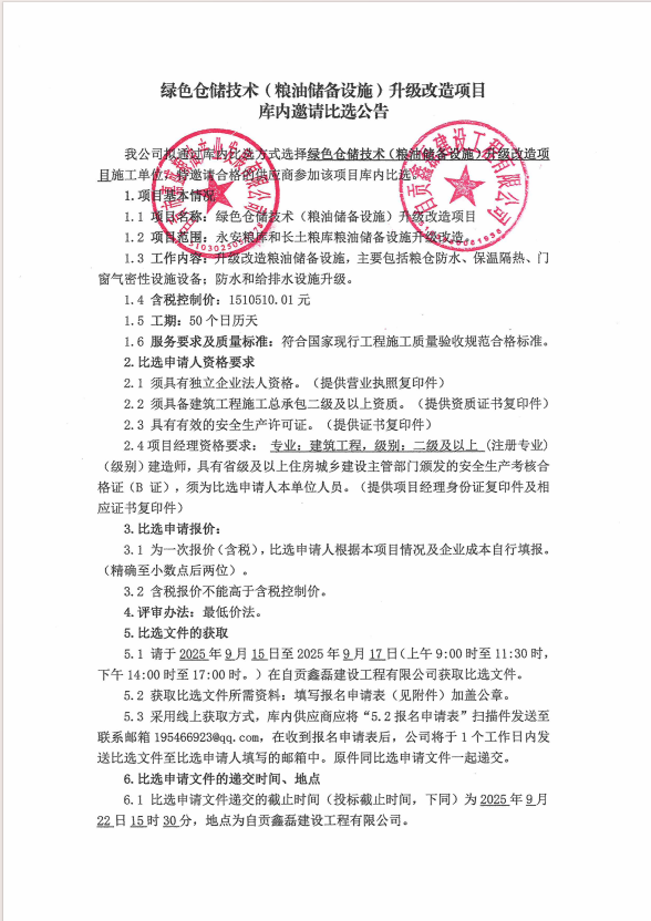绿色仓储技术(粮油设备设备)升级改造项目库内邀请比选公告